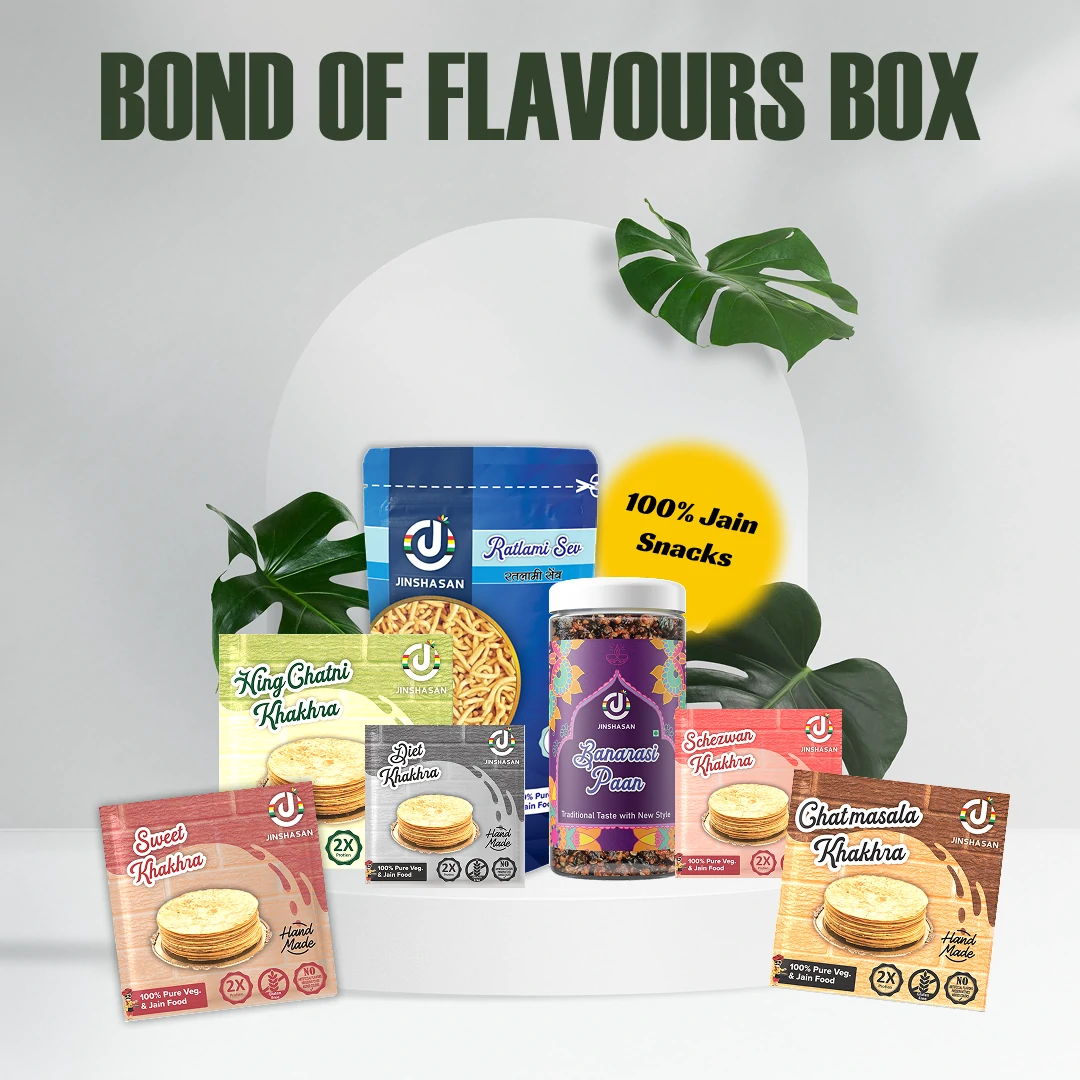 True to its name, the Bond of Flavours Combo brings you a burst of flavor in every bite. This Diwali festive box includes 5 distinct Khakhras, each with its own unique flavor—spicy Pizza, tangy Hing Chatni, zesty Pani Puri, aromatic Jeera, and sweet classic Khakhra. Paired with the iconic Ratlami Sev and refreshing Banarasi Pan, this combo is a whole mood! Made using 100% Jain ingredients, it’s a delicious way to celebrate Diwali with loved ones, guilt-free and full of joy.
