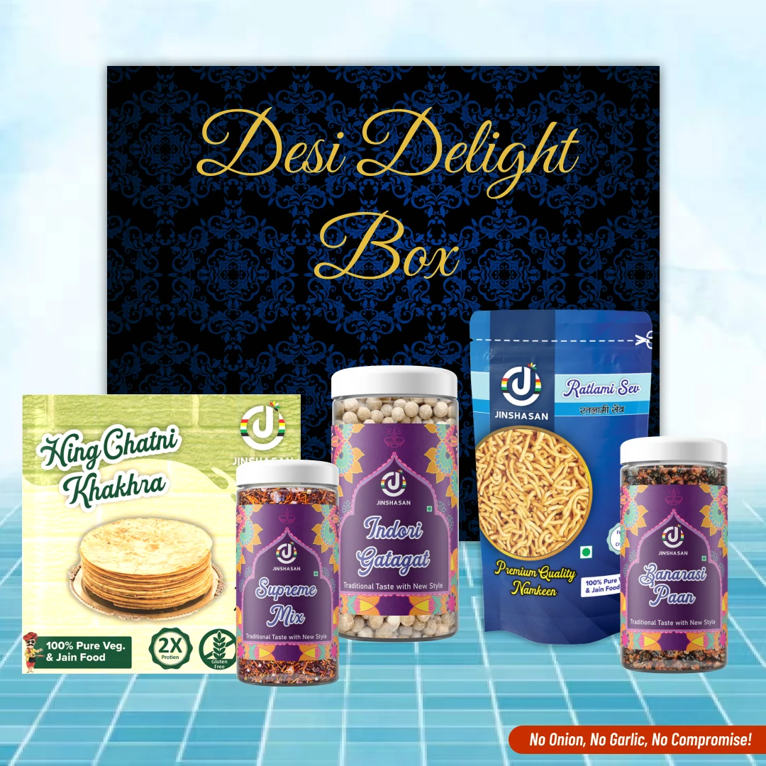 Celebrate the spirit of Diwali with a desi twist! The Desi Delight Box brings together the fiery crunch of Ratlami Sev, flavorful Hing Chatni Khakhra, and sweet-sour nostalgia with Gattagat. Add the cool freshness of Banarasi Pan and the aromatic crunch of Mukhwas—and you’ve got a complete festive treat box! Made with 100% Jain ingredients, this combo is perfect for gifting to loved ones who cherish authentic Indian snacking with a thoughtful twist. A celebration of flavor, tradition, and joy—all in one box.
